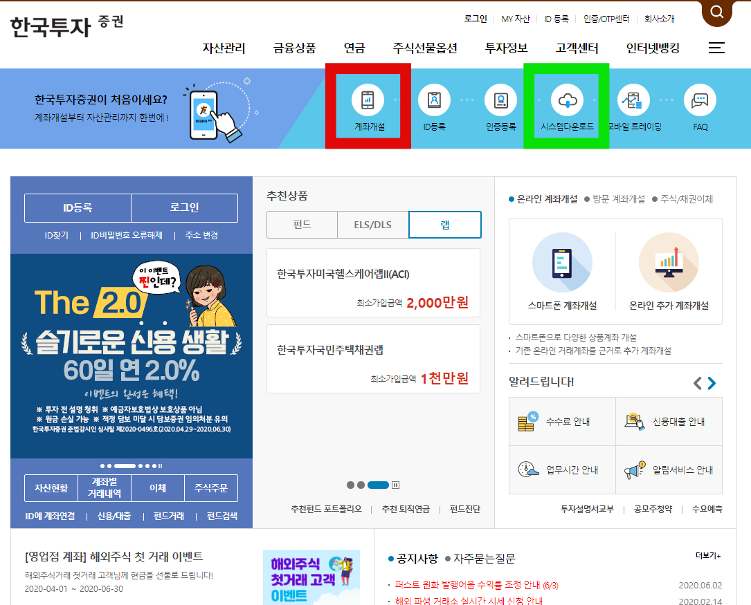 먼저 한국투자증권 홈페이지에 가셔서 빨간색 네모를 클릭하시면 계좌 개설 관련 내용을 더 정확하세 알아보실 수 있습니다. 이미 계좌가 있으신 분들은 '시스템 다운로드'를 클릭하시면 됩니다.