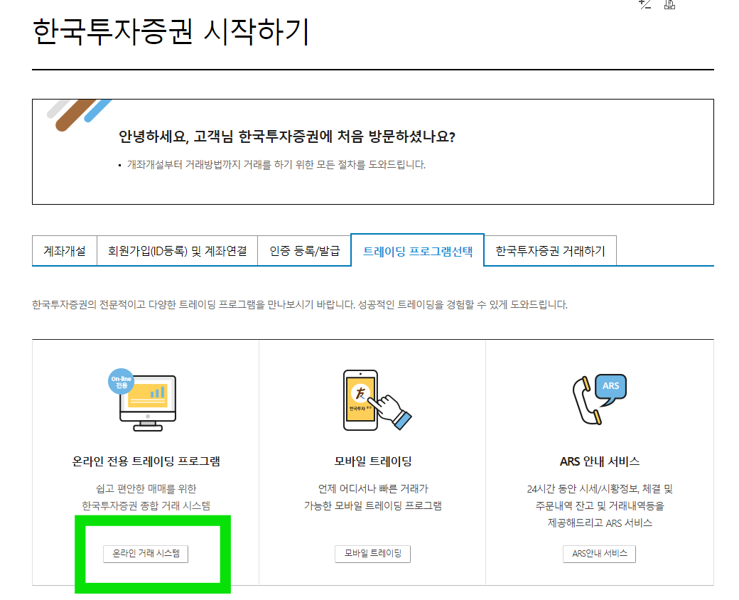트레이딩 프로그램을 선택하셔야 되는데요, 컴퓨터를 이용해서 주식 매매를 하실 분들은 '온라인 전용 트레이딩 프로그램'을 다운로드하셔야 됩니다. PC에서 매매하는 것을 HTS라고 하고 모바일로 매매를 하는 것을 MTS라고 하니 참고하시길 바랍니다.