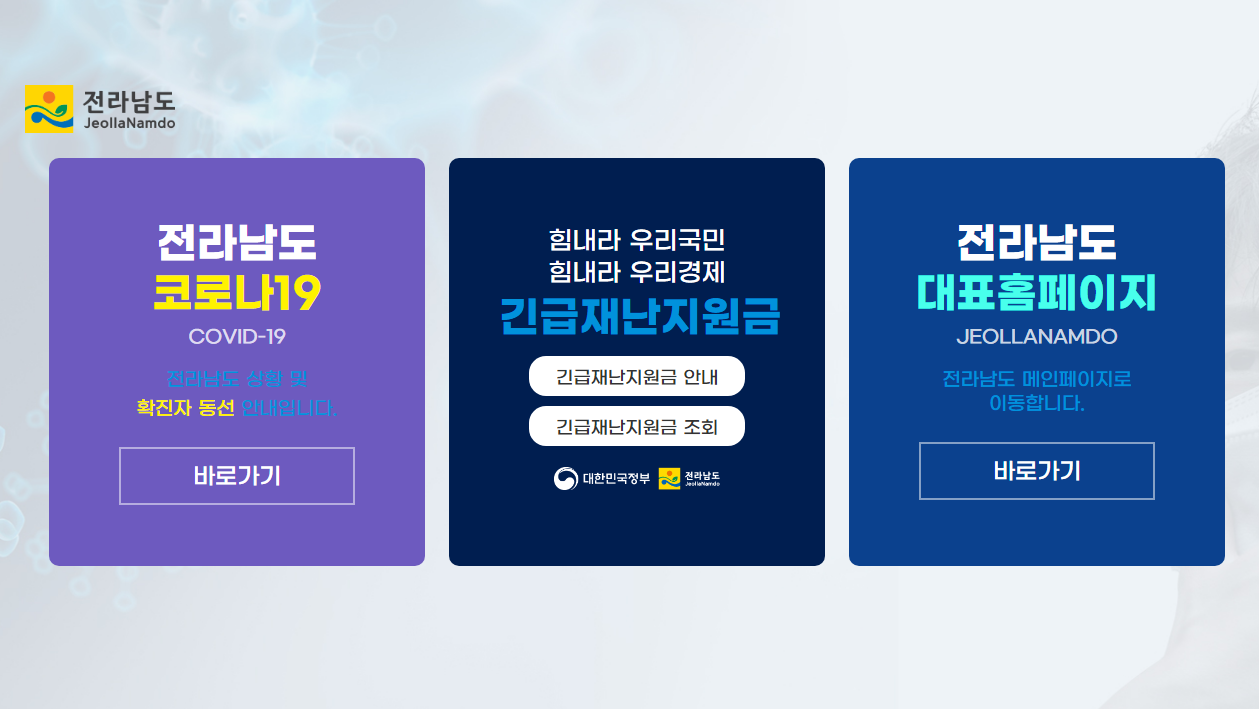 어느 지차체 홈페이지와 마찬가지로 전남도청도 첫 화면이 코로나와 긴급재난지원금 관련 정보에 바로 갈 수 있게 해 놨습니다. 물론 편리한 건 사실이지만 빨리 코로나 사태가 완전히 종식됐으면 좋겠습니다.
