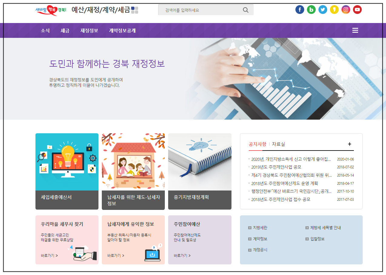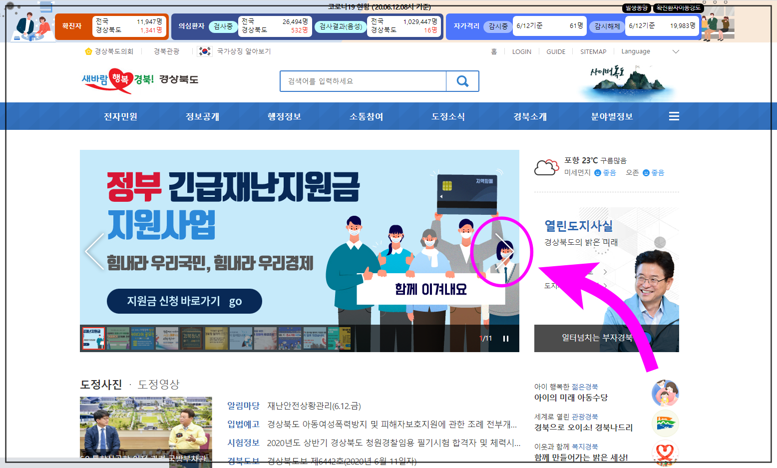 맨 좌측 메인으로 들어가면 각종 공지사항을 한눈에 들어오게 볼 수 있는데요, 화살표 방향을 클릭하면 포스트 코로나 지역경제 활성화 아이디어 공모전, 전국 체육대회, 경북 청년 일자리 정책, 아동수당, 중소기업지원시책, 금융지원센터, 각종 표창 추천 등이 안내되어 있습니다.