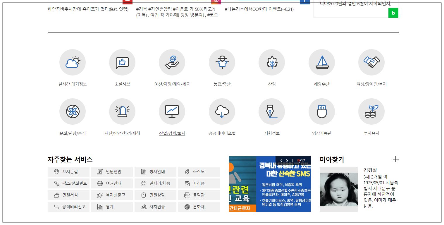하단으로 조금 내리시면 사람들이 많이 찾는 카테고리가 나오는데요, 여성 장애인 복지, 농업/축산, 실시간 대기정보, 재난/안전/환경/재해 등 각종 정보를 열람할 수 있으며, 일자리 채용, 신문고 등 민원에 관련된 곳도 손쉽게 찾을 수 있게 배치해놨습니다.