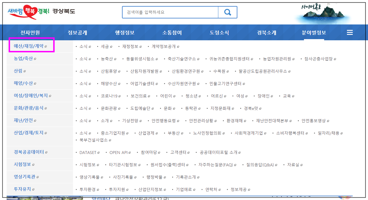 다시 경상북도 홈페이지 상단으로 가셔서 우측에 '분야별 정보'를 클릭하시면 정말 많은 분야가 나오는데요, 여기서 더 자세하게 알고 싶은 분들은 좌측에 원하는 메뉴를 클릭하시면 됩니다.