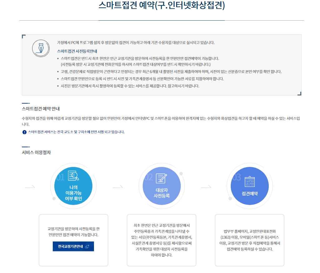 스마트 접견을 이용하기 위해서는 프로그램 혹은 어플을 설치해야 되는데요, 법무부 온라인 민원서비스에 메뉴얼이 나와있으니 천천히 보시는 것을 추천합니다. 이 내용은 저가 직접 해보고 차후에 포스팅을 해서 쉽게 알려드리겠습니다.