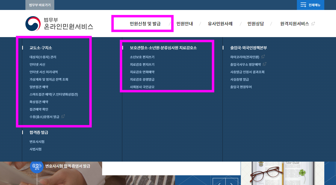[민원신청 및 발급]을 클릭하시면 교도소나 구치소에 인터넷 서신을 보내는 기능이 있어서 직접 편지를 써서 우체국에 갈 필요가 없습니다. 단, 보호 감찰소, 소년원 그리고 치료감호소에 편지를 쓰는 것은 인터넷 서신이 아닌 소년보호 편지 쓰기 또는 치료감호 편지 쓰기를 이용하셔야 되니 이점 착오 없으시길 바랍니다.