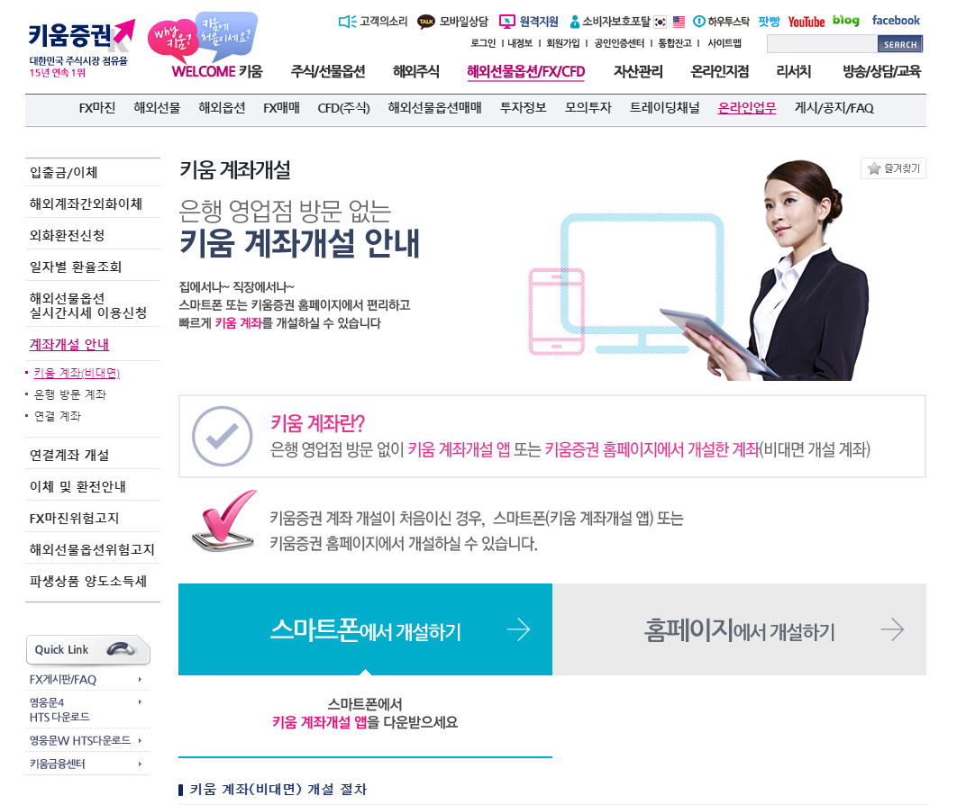 먼저 HTS뿐만 아니라 해외선물 전용 계좌를 만들어야되는데요, 이것 또한 마찬가지로 직접 증권사에 방문해서 만들어도 되지만 모바일과 인터넷을 통해서 계좌 개설을 할 수 있습니다.