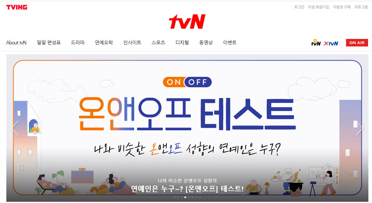 kbs홈페이지와 다르게 TVN은 좌측 상단에 '온에어' 버튼이 있는데요, 여기 또한 저곳으로 가시면 바로보기가 가능합니다. 하지만 각 채널마다 일일이 해당 채널을 서비스하는 페이지에 들어가기가 매우 번거로울 수 있는데요, 이러한 불편함을 해결해주는 곳이 있습니다.