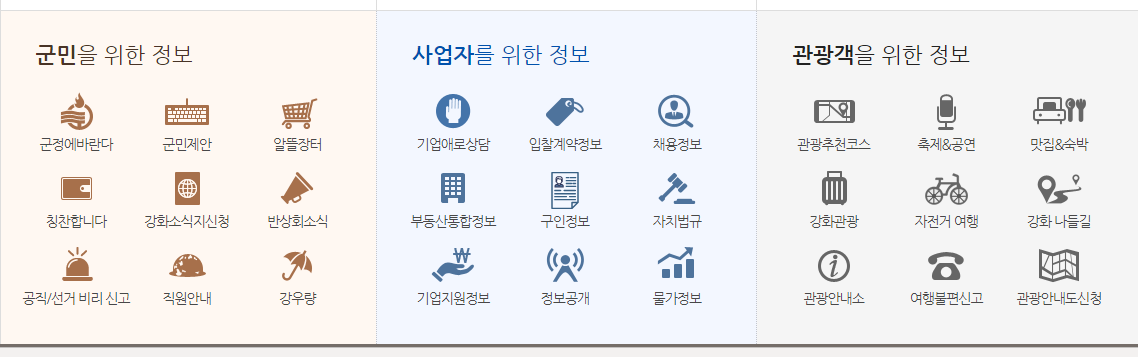 홈페이지에 들어오신 뒤 아래로 내리시면 군민을 위한 정보, 사업자를 위한 정보, 관광객을 위한 정보가 나옵니다. 강화군에 거주하는 군민들은 반상회 소식과, 알뜰장터 등을 이용하실 수 있고, 사업자를 위한 정보에 있는 구인정보와 채용정보를 활용해서 일자리를 구하실 수 있습니다. 고령으로 인해 취업활동이 힘드신 분들은 [채용정보]-[취업연계 사이트]-[인천광역시노인인력개발센터]로 들어가시면 도움을 얻을 수 있습니다. 그밖에 강화군에 방문하고 싶은 분들은 관광 추천 코스와 숙박 정보 등을 얻을 수 있습니다.