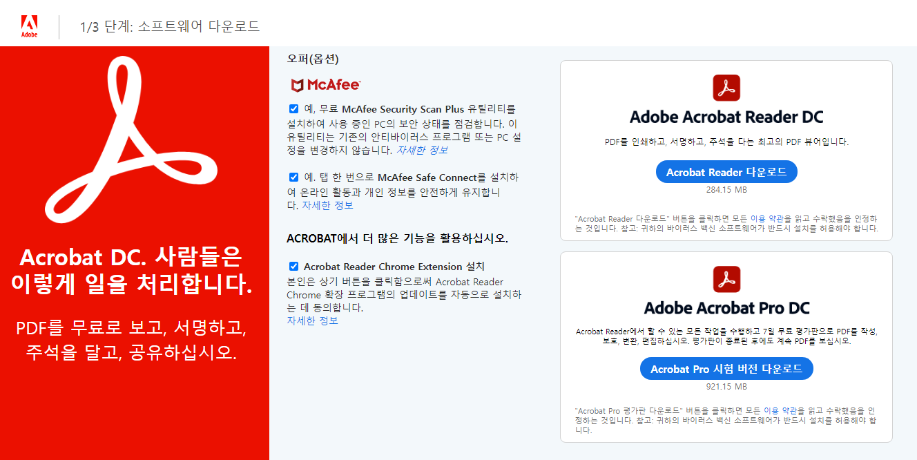우선 사람들이 흔히 사용하는 어도비 사에서 설치하는 방법을 알려드리겠습니다. 어도비 홈페이지에서 접근하는 방법도 있지만 (https://get.adobe.com/kr/reader/) 이 주소로 바로 가시면 위 사진과 같은 곳으로 들어갈 수 있습니다. 여기서 상단에 있는 "아크로밧 리더 다운로드"를 선택하시면 됩니다. 짧은 로딩 후 해당 파일을 저장할 수 있는데, 저장 된 곳으로 이동하신 후 인스톨 파일을 실행시켜 설치를 진행하시면 됩니다.